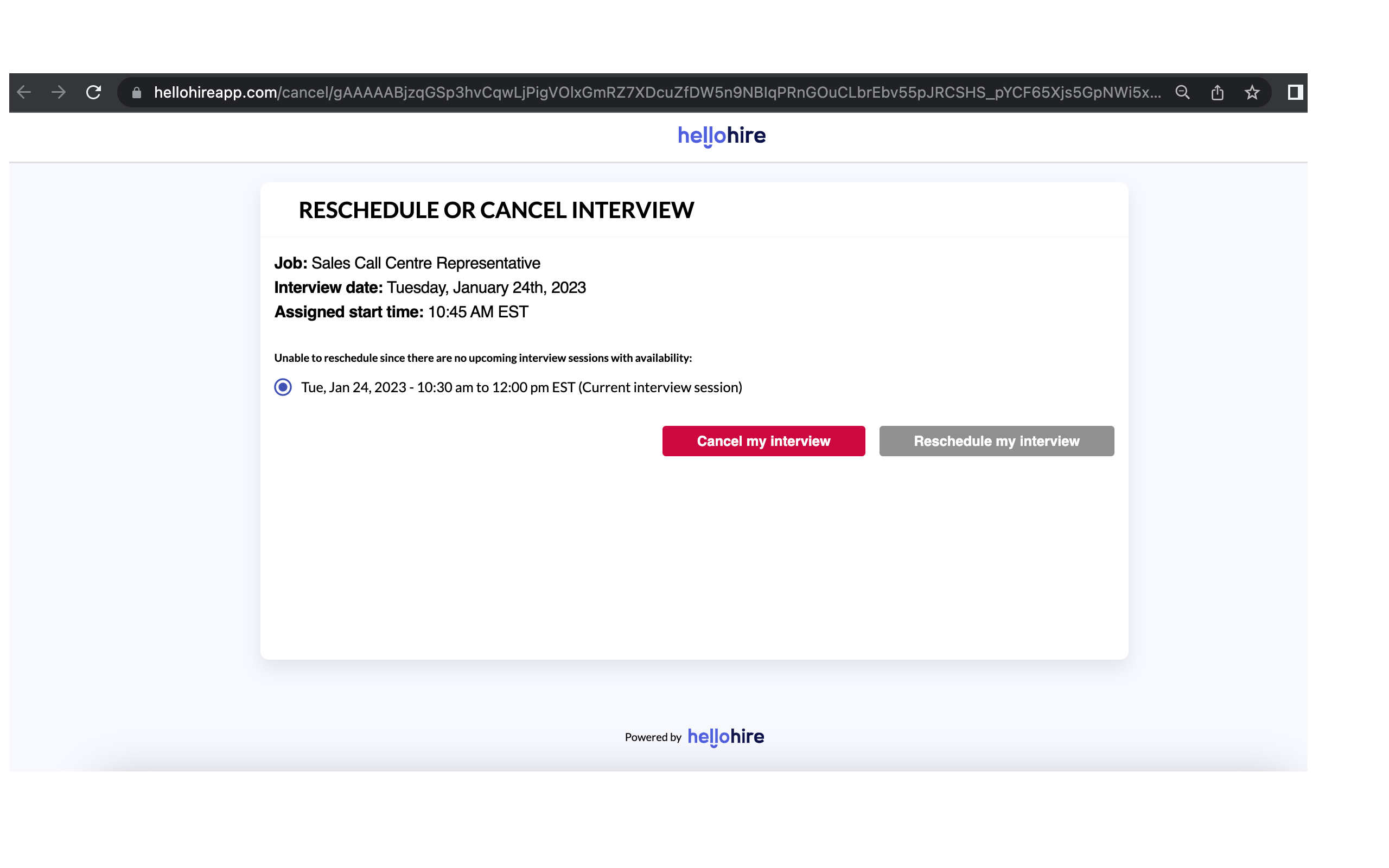 You may select any of the alternative interview times, and click the grey 'Reschedule my interview' button to confirm the new time. You may also directly click the red 'Cancel my interview' button to cancel your session altogether.