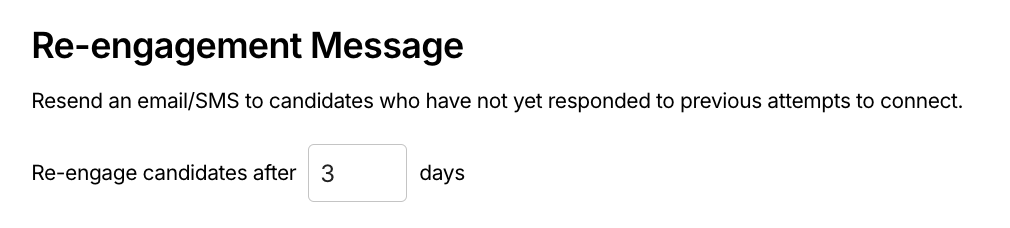 - Click Submit, and we will invite them instantly by email and SMS message through their phone number, and we will send additional reminders via text and email 24 hours later if they do not engage or schedule an interview with you! A third round of email and text reminders will be sent at a time of your choosing with the re-engagement feature turned on via the Engage tab pictured below: