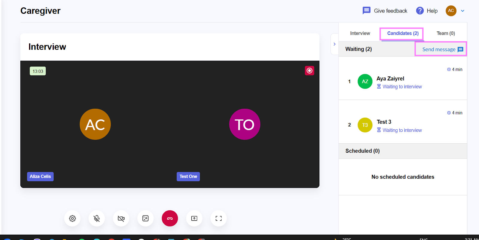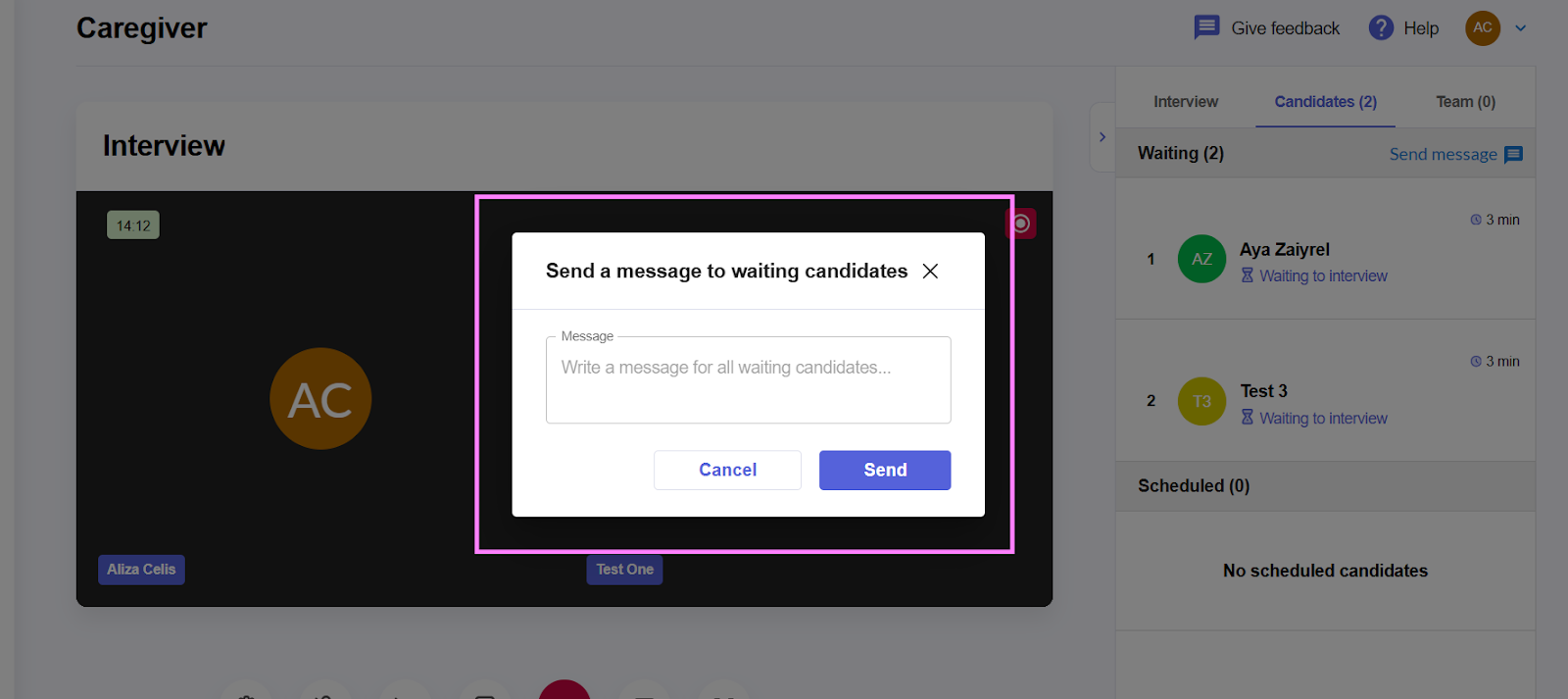 Sometimes, you might want to send a quick message to a candidate while they’re waiting — maybe your last interview runs a bit longer than expected, you need to wrap something up, want to give them a heads-up, ask them to get ready, or just keep them informed.