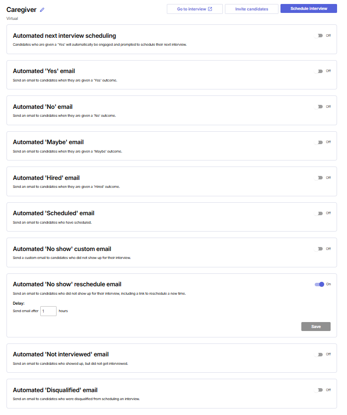 You can set up and enable automations to send automated emails to candidates based on the options shown in the screenshots below. Here are some commonly used automations that can be enabled: