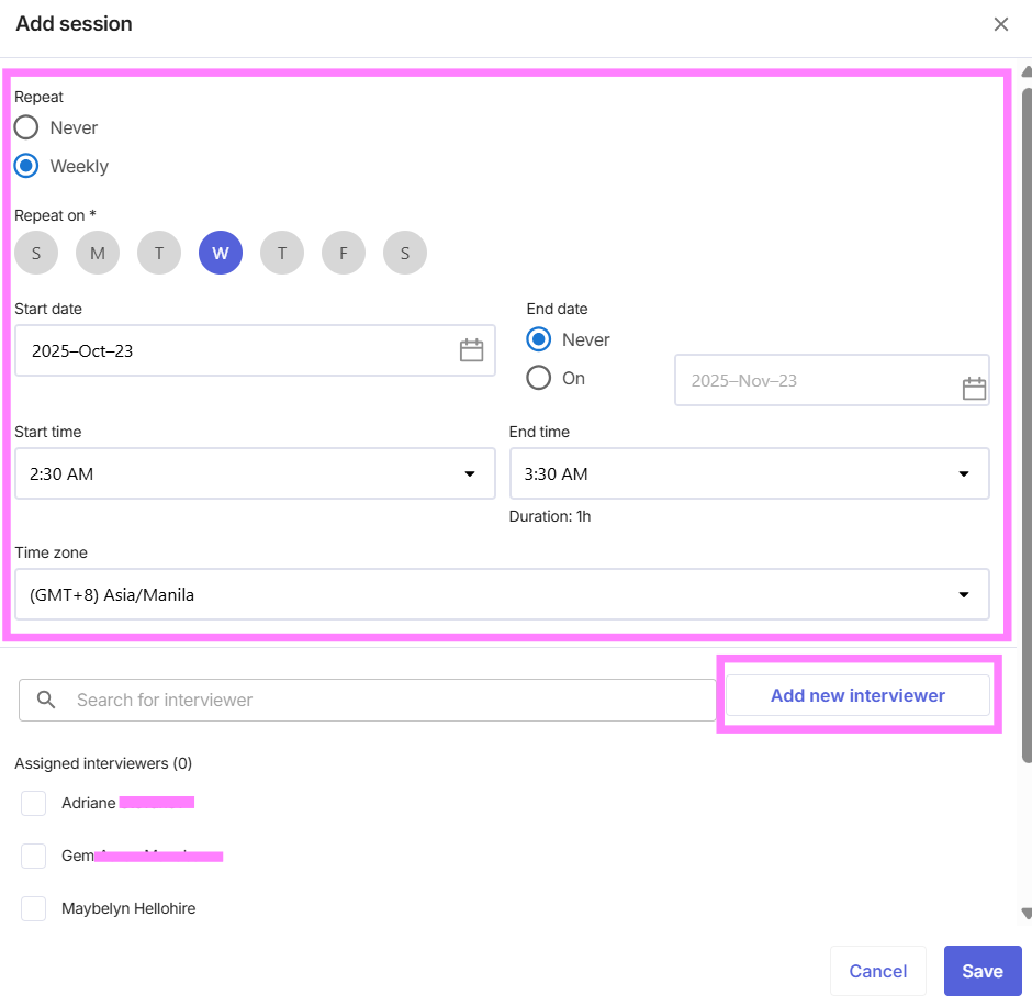 - Weekly – if this is a recurring session; then select the days it will occur.