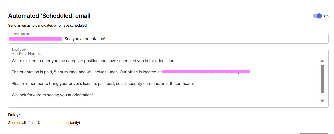 We recommend enabling the Automated "Scheduled" Email. This ensures candidates receive a notification confirming their booking, along with any important details about the orientation (e.g., location, time, what to bring, or additional instructions). Including a clear and relevant information in the email body helps reduce no-shows and ensures candidates are well-prepared.