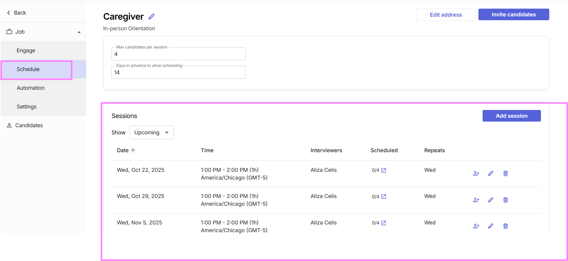 When a candidate requests to reschedule their in-person orientation, you can quickly cancel their existing session and assign them to a new time slot.