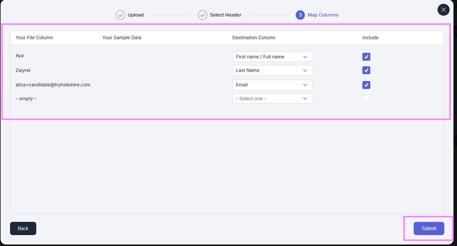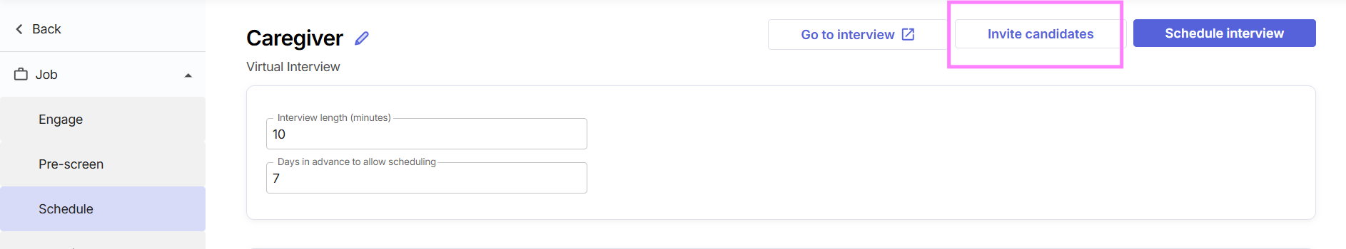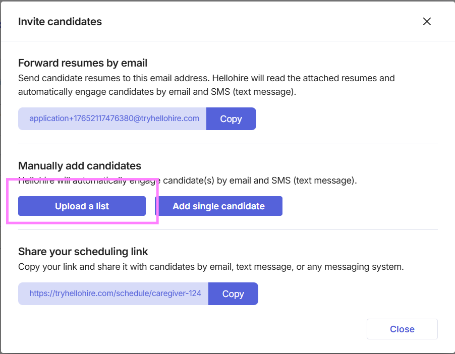 All candidates included in the file will be added to the job and contacted automatically via email and/or SMS with a scheduling link to book their interview. Once added, their candidate status will be set to “Contacting.”