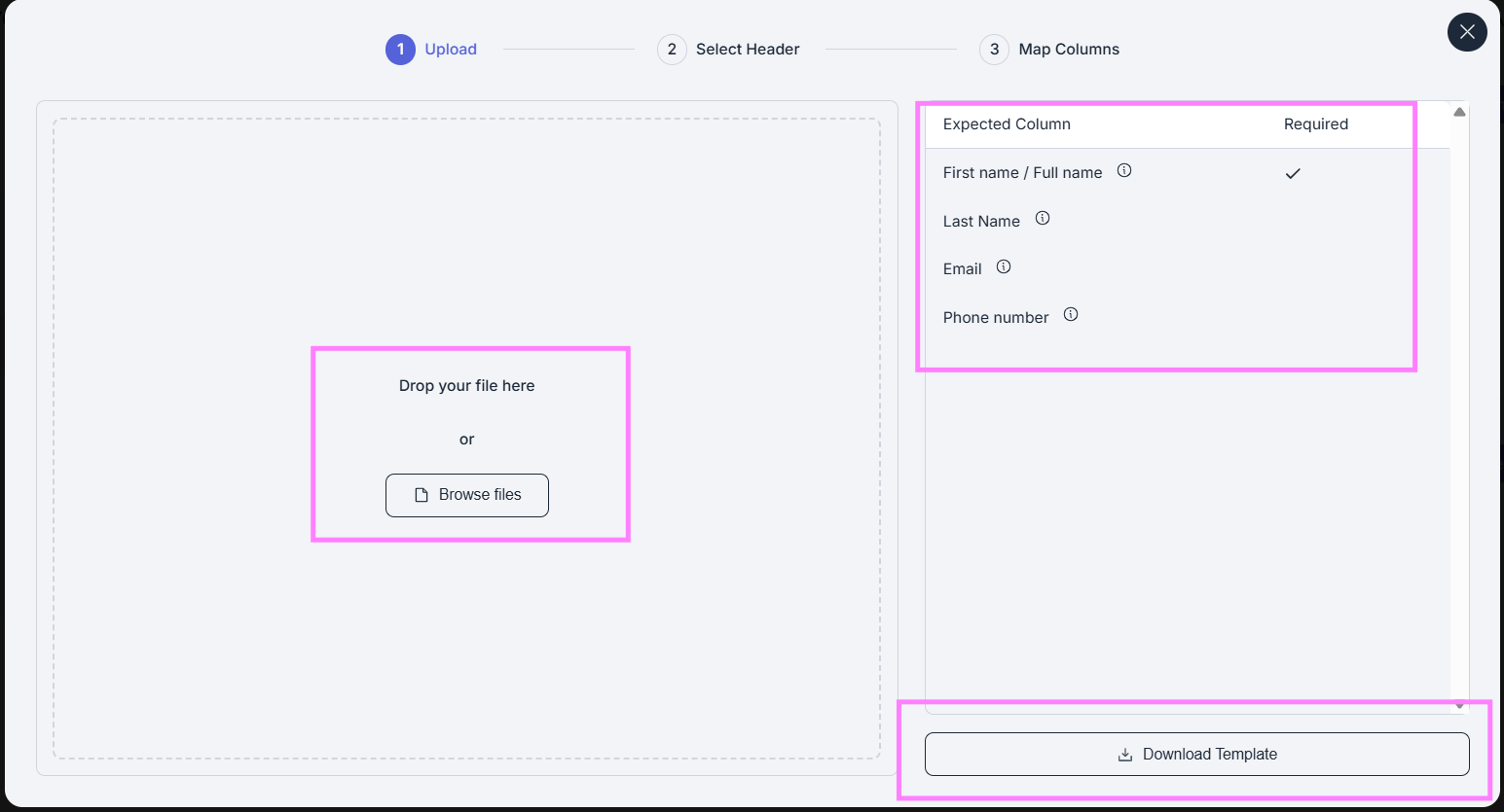 If prompted, please map the columns accordingly. You may also download a template, which can be found in the lower-right corner of the page.