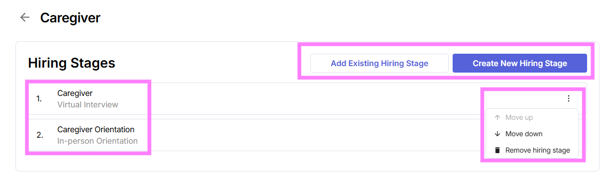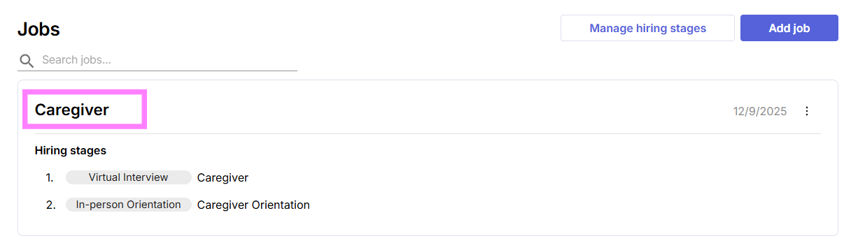 When you go to Jobs, you’ll now see each job listed along with its Hiring Stages. This makes it super easy to understand your hiring process at a glance. For example, a job might show stages like:
