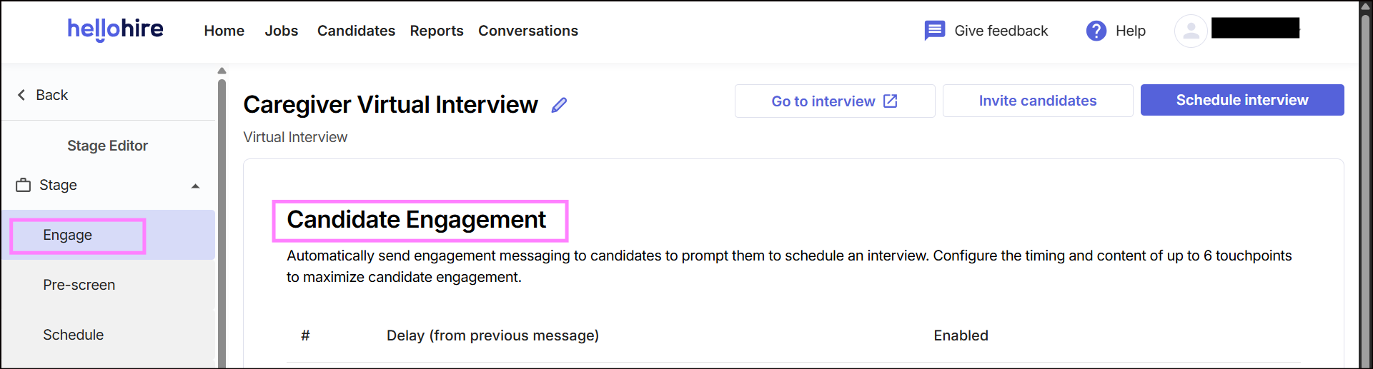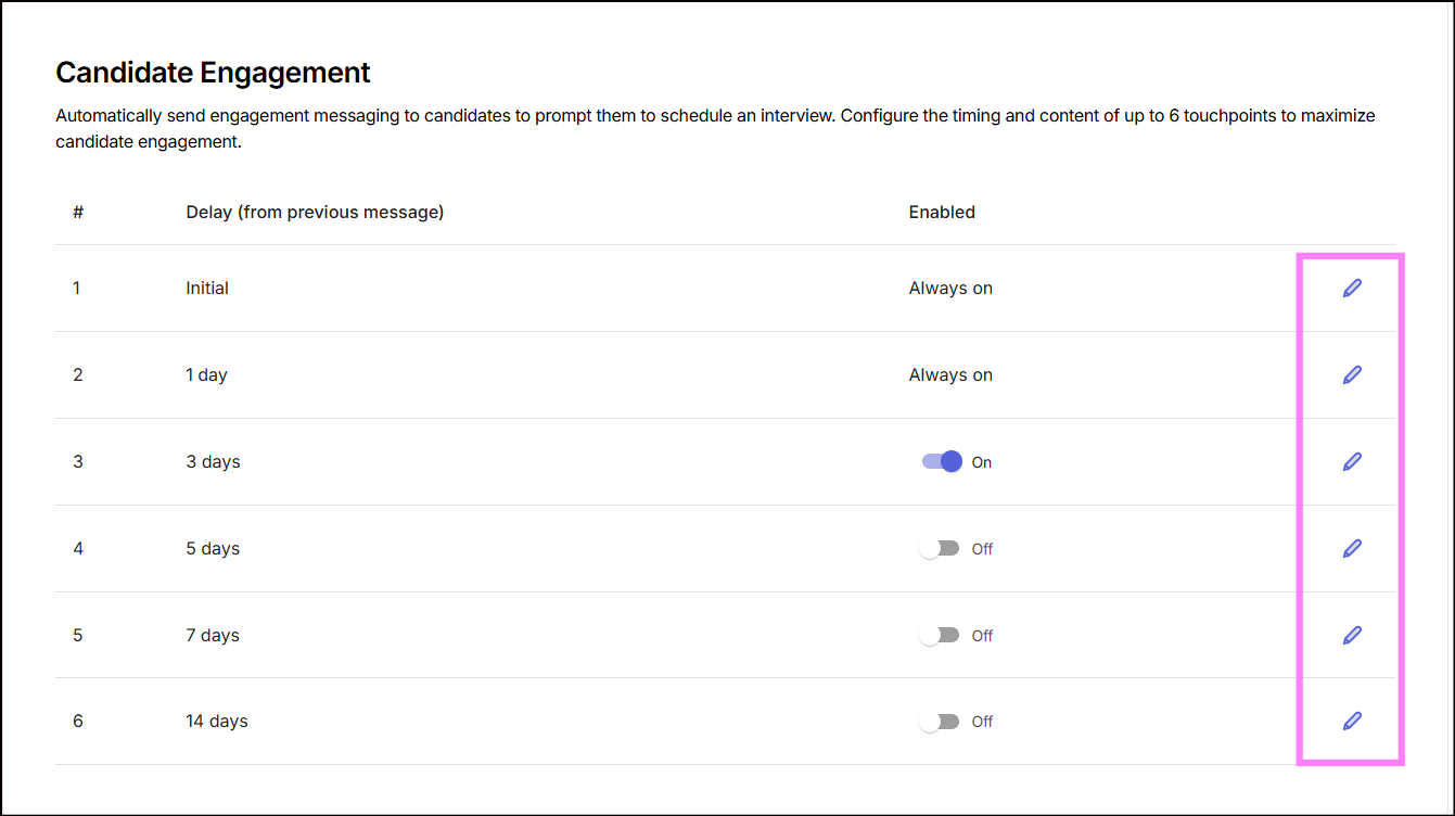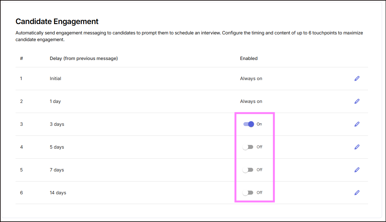 To activate candidate engagement messaging, simply toggle the on/off button in the Candidate Engagement section. Once enabled, candidates will automatically receive messages based on your configured schedule.