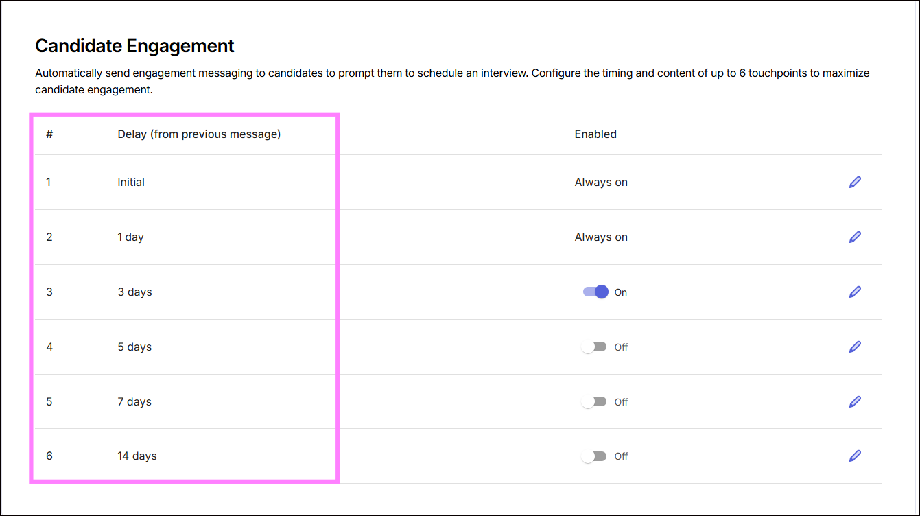 - Each touchpoint has a default number of days between messages, but you can adjust this to fit your hiring timeline.