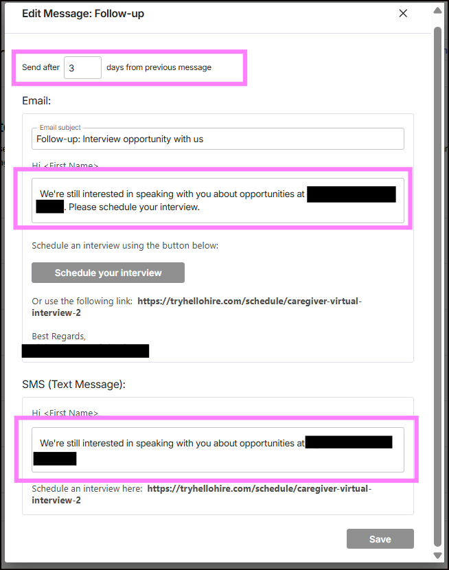 You can manage these settings in the Candidate Engagement section of Hellohire. There, you’ll find options to configure your Drip Campaign (touchpoints), adjust the schedule, and personalize message content to fit your hiring needs.