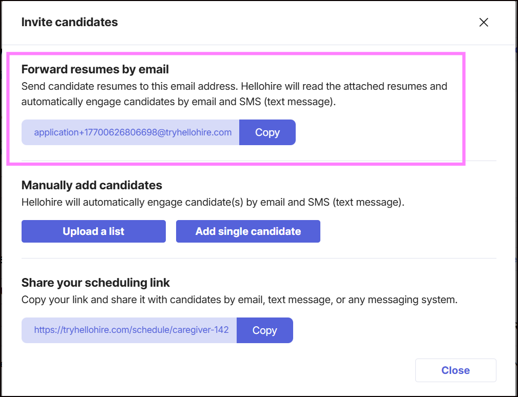 The Invite candidates by email feature allows you to forward candidate leads directly to Hellohire.