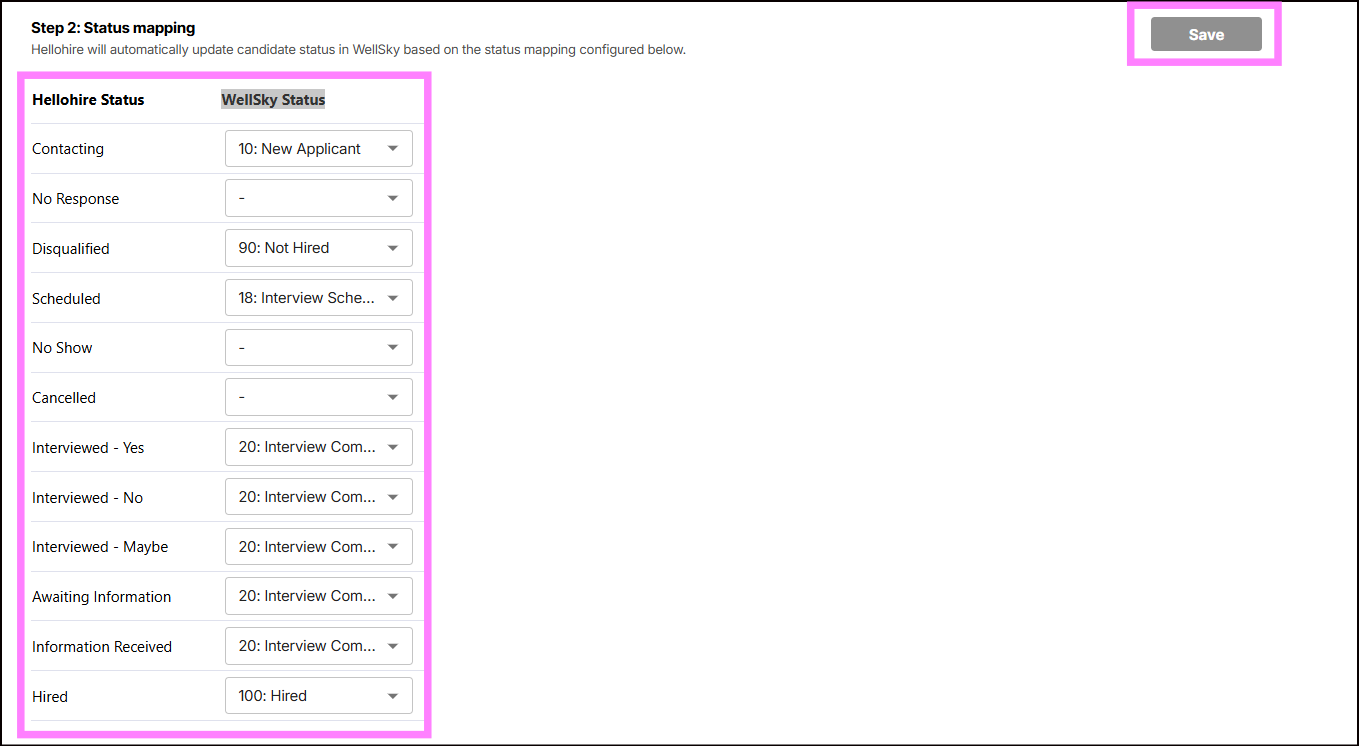 Hellohire will automatically update the candidate’s status in WellSky based on the status mapping configured in Hellohire.