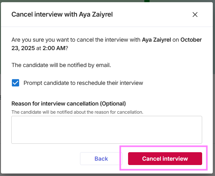 Continue to confirm the cancellation and click Cancel interview.
