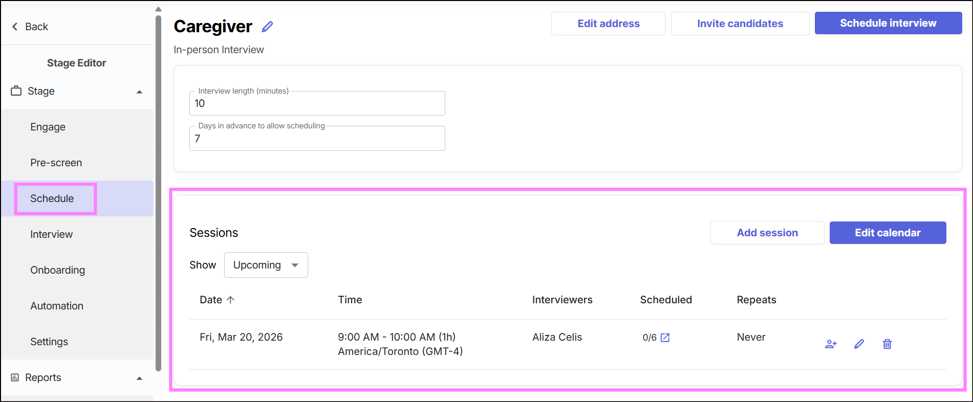 When a candidate requests to reschedule their in-person interview, you can quickly cancel their existing session and assign them to a new time slot.