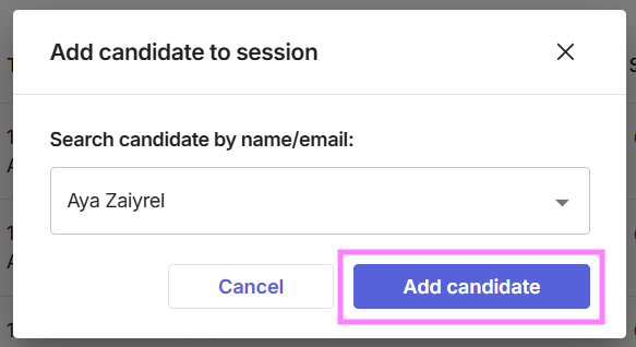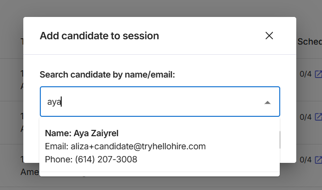 - Search for the candidate by name or email address, then select them from the results.